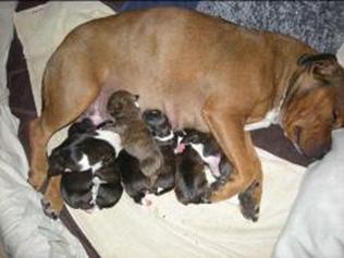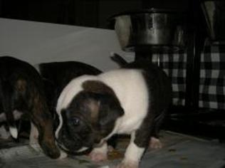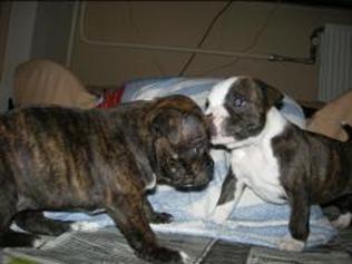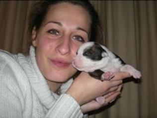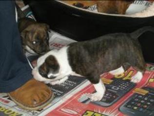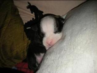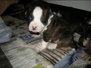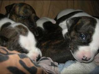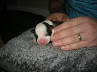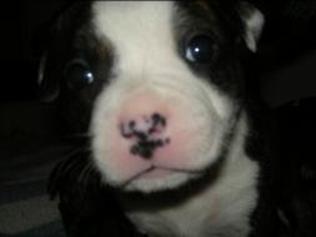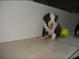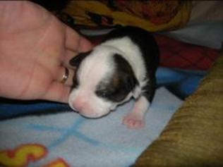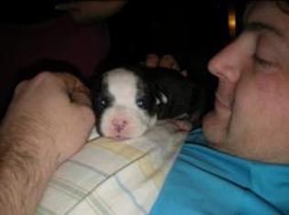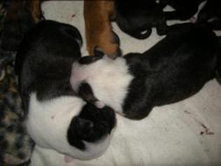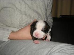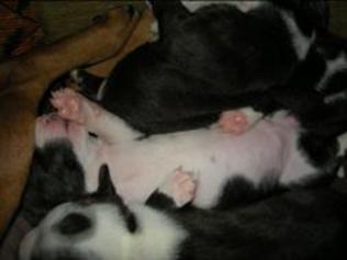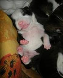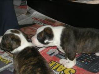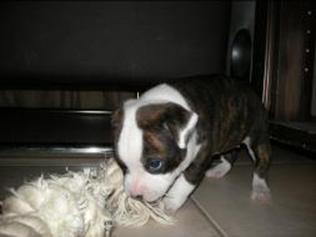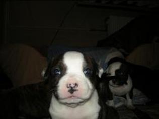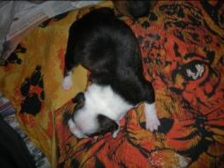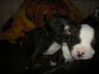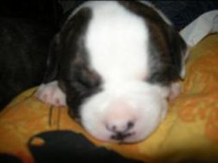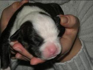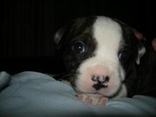 Puppy dossier: Breed: Staffordshire Bull Terrier Born: 07-01-2010 Sex: Female Weight: (03 Feb) 1720 grams Color: Black/ Brindle with white head and two black eyes |