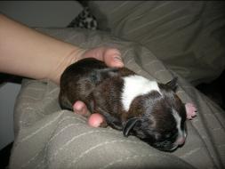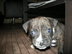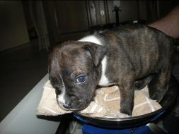Puppy Dossier: Breed: Staffordshire Bull Terrier Born: 07-01-2010 Sex: Female Weight: (03 Feb) 1380 Grams Color: Black with white nose stripe |
