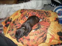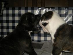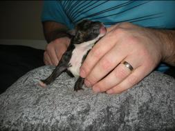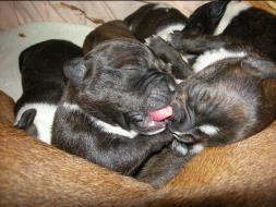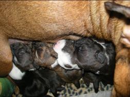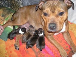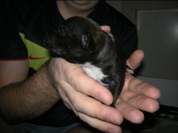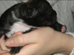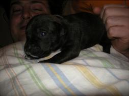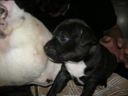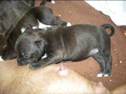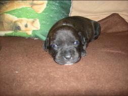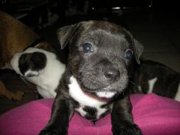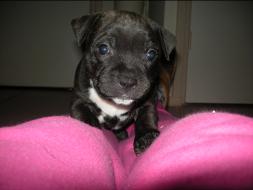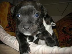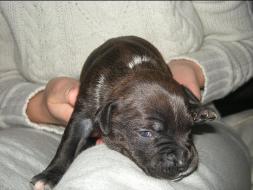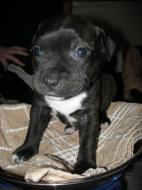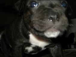 Puppy Dossier Breed: Staffordshire Bull Terrier Born: 07-01-2010 Sex: Female Weight: (03 Feb) 1500 Grams Color: Black with small white mark on her back |