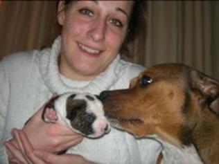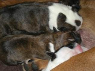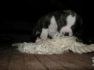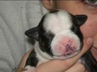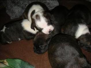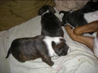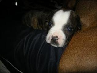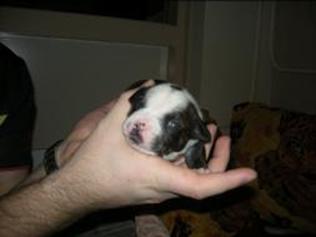 Puppy dossier: Breed: Staffordshire Bull Terrier Born: 07-01-2010 Sex: Female Weight: (03 Feb) 1640 Grams Color: Dark brown/ Brindle with white head two dark eyes and a dot |