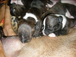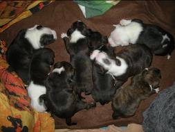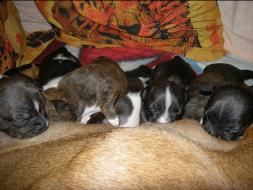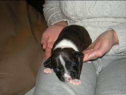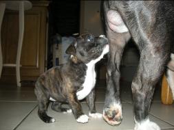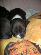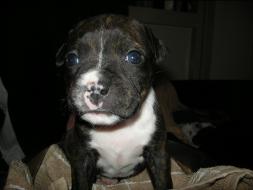 Puppy Dossier: Breed: Staffordshire Bull Terrier Born: 07-01-2010 Sex: Female Weight: (03 Feb) 1380 Grams Color: Black with white nose stripe |