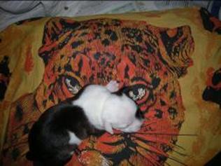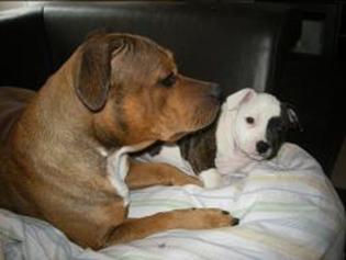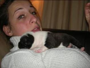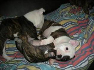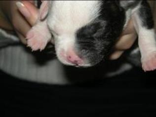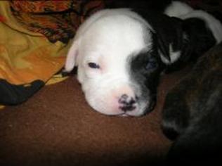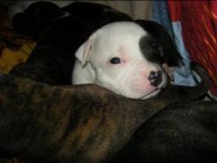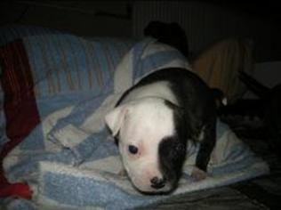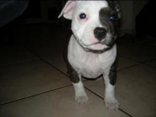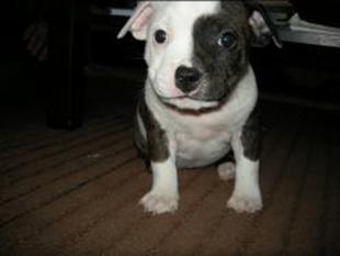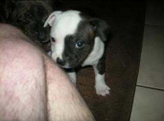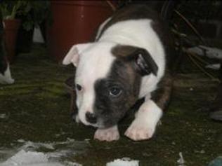 Puppy dossier: Breed: Staffordshire Bull Terrier Born: 07-01-2010 Sex: Female Weight: (03 Feb) 1320 Grams Color: Black/ Brindle with white head and one black eye |